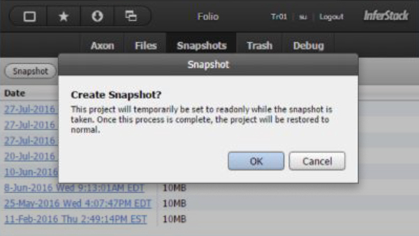 2. Press the ‘Snapshot’ button on the upper left-hand side of the Snapshot tab, when prompted to create a snapshot select the ‘OK’ button to begin. This process may take longer depending on the size of the database, progress can be seen in the upper right-hand side of the Snapshots Tab.