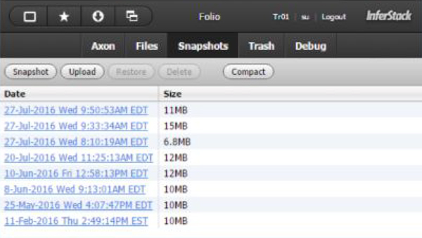 1. Go to the Folio app and select the Snapshots tab2. Press the ‘Upload’ button and then ‘Choose File’ or drag and drop the archived database.3. Select the database to restore and then press the ‘Restore’ button