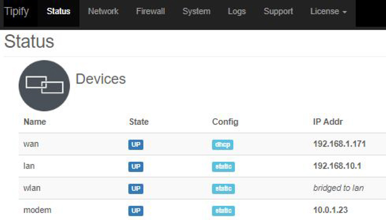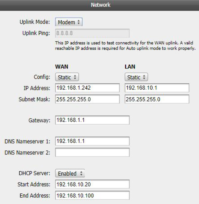 - Network - Includes Uplink Mode, Uplink Ping, WAN Config, LAN Config, Gateway, DNS Nameservers and DHCP Server.