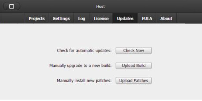2. Select the ‘Check Now’ button for automatic updates, ‘Upload Build’ if you have a full build for offline updating, ‘Upload Patches’ for any pod files.