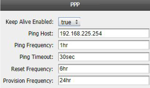 - PPP - Includes Keep Alive, Ping Host, Ping Frequency, Ping Timeout, Reset Frequency and Provision Frequency.