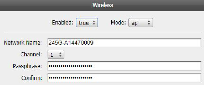 - Wireless - Includes Enabled, Mode, Network Name, Channel, Passphrase and Security (if Client).