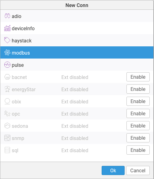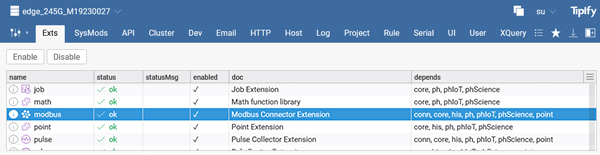 3. Under the Exts Tab of the Settings App, highlight the "modbus" extension.