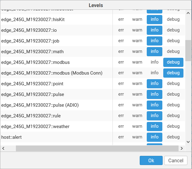 Access the debugging logs for Modbus by going to the Debug App, then into the Log tab and clicking the Levels button found on the right- hand side of the tab. Once a new window pops up, find the Modbus options and switch them to debug, and click OK.
