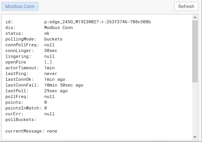 - dis – Display Name – This is the name the system shows to reference the modbus connection.