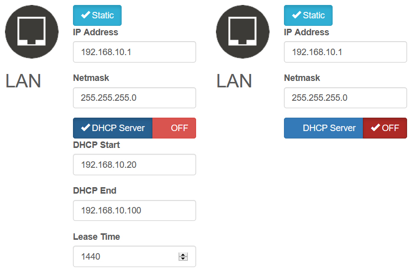 LAN lets you set IP Address, Netmask, DHCP ON or OFF, DHCP Start