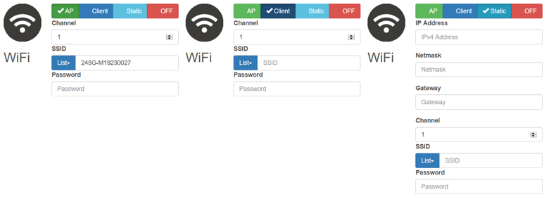 WiFi lets you set WiFi Mode (Access Point, Client, Static or OFF), Channel, SSID and Password.